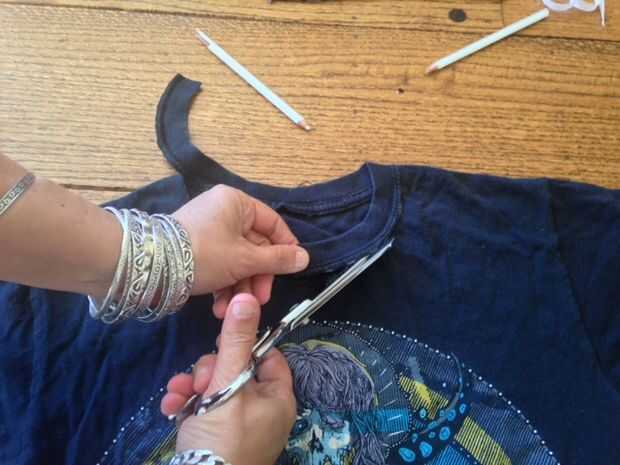 Comience cortando la banda de cuello de la camiseta. Puede utilizar la costura como una guía. Entonces puesto le en su forma del vestido o de la persona. Mejor tener un cuerpo para hacer el siguiente paso desde su muy difícil de hacer en su auto...