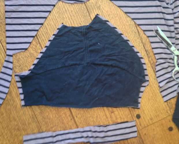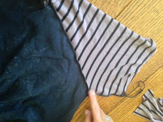 Ahora agarra a la tela y doblar en dos. Coloque la manga de corte en la parte superior y cortar hacia fuera añadiendo margen de costura de 1/2" en las costuras de las axilas. Usted está listo para coser! Utilicé a una remalladora pero una máquina de coser a una puntada strechy haría muy bien también. Unir la manga y la clavija de la costura hasta la muesca debajo del brazo. Entonces a partir de la puntada del cuello la manga de camisa, repita en el otro lado. Estás tan cerca! Ahora el dobladillo hasta el cuello y las mangas para un bonito mire ni para true rocker glam, dejaron los bordes crudos regla!