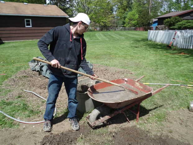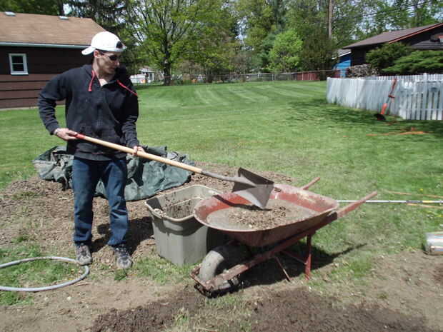 Así que, una vez que ha agregado la mezcla de tierra/corteza en el agua, toma el rastrillo y mezcla todo, así que no hay ninguna montaña de material seco en la carretilla, todo tiene que ser bajo el agua. Siempre puede agregar más agua también.