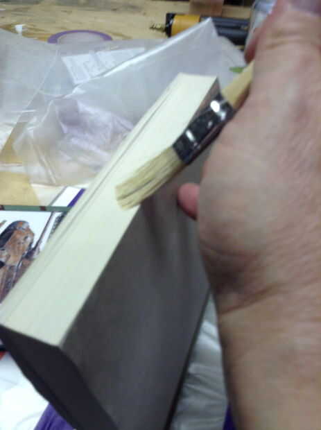 Con las cubiertas de protección, mezclar un poco de pegamento blanco de Elmer y agua en aproximadamente 2/3 cola y agua de 1/3. Intenta conseguir pegamento mocosa y la mezcla no es crítico. Simplemente Cepille la mezcla de pegamento en la parte exterior de las páginas de su libro con un cepillo. Empape bien por pasar un par de veces. Cuando haya terminado, cierre el libro y apilar algo de peso encima para evitar páginas arrugadas. Deje el libro secar durante un par de horas o durante la noche ideal.