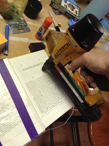 Para mantener juntas las páginas una vez que se han cortado ellos, clavo o grapa junto con un arma de poder. Utilizar grapas de corona de 6-8 que penetran aproximadamente 3/4 de espesor del libro. Uñas la parte delantera y la espalda para hacer un bloque sólido.