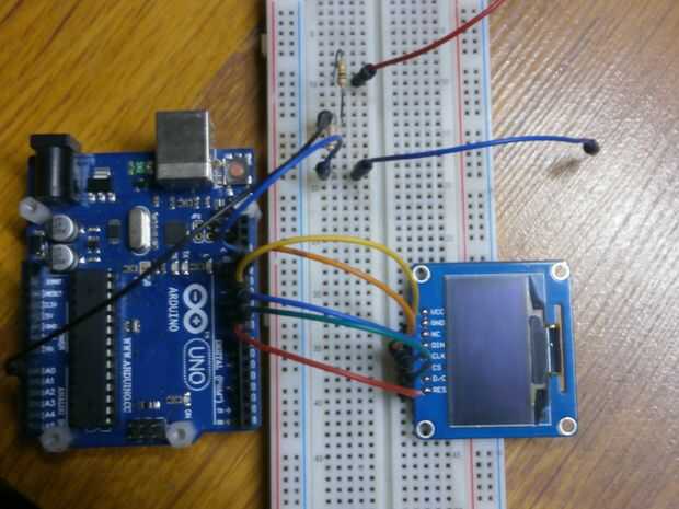Ahora vamos a ver cómo construir el voltímetro. Este primer paso es colocar la placa OLED en el protoboard. Luego conectar el pin 13 a CLK, pin 11 DIN, pin 9 a CS, pin 8 a D/C y pin 7 a RES.
