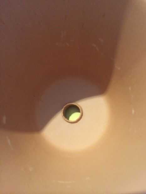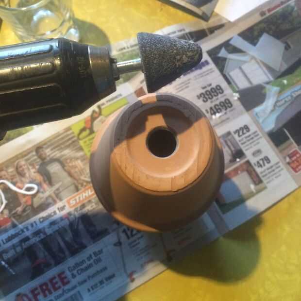 Usando el taladro y la piedra, limpiar las marcas de fundición en ambas ollas. Puede utilizar la piedra para abrir el orificio de drenaje en una de las macetas. Usted usará esta olla para la parte superior. El agujero más grande hace más fácil llenar la olla con agua.