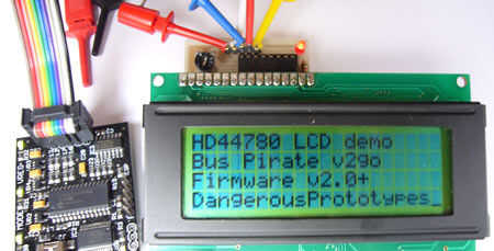 Pantallas LCD HD44780 son generalmente piezas de 5 voltios con una fuente independiente para la luz trasera. El Bus Pirate sólo tiene cinco pines I/O de 5 voltios tolerantes, así que hicimos un pequeño adaptador de junta con suficientes pernos para controlar el LCD. El Bus Pirate controla el tablero de adaptador a través de su biblioteca de interfaz LCD.