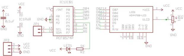El PCF8574 funciona desde 2.5 a 5volts. Los pines de I/O funcionan con la tensión de alimentación, así que si lo alimentamos a 5volts interfaces el LCD a 5volts. C1 (0.1uF) desempareja lo IC de las fluctuaciones en el suministro de energía.
