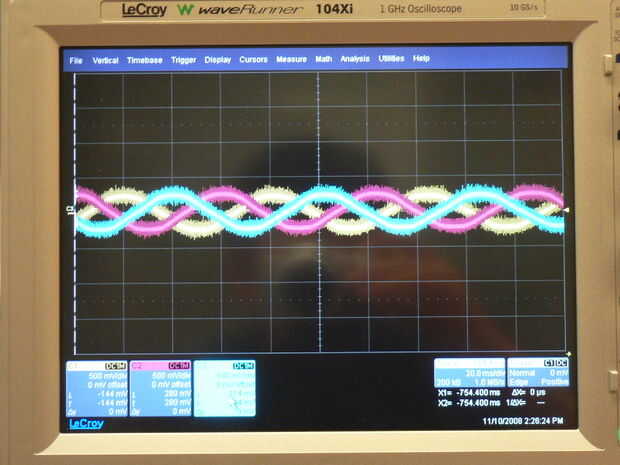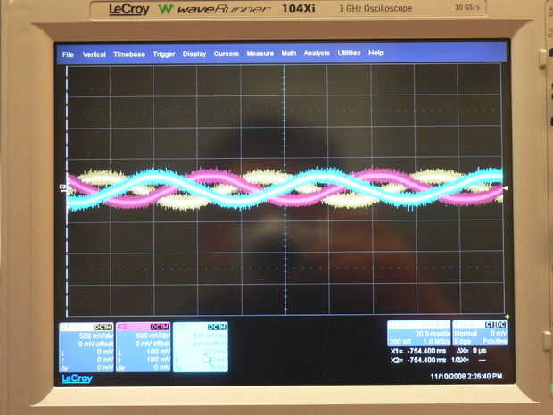 Las imágenes de alcance a continuación muestran las tres formas de onda que se generan cuando se hace girar el plato del disco duro a mano (se fija la escala de 500mV por división en el eje vertical, y 20 ms por división en el eje horizontal). Tres formas de onda sinusoidales de fase desplazada¡ perfecto!