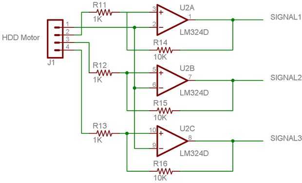 Cuando la tensión de un perno de la señal desde el disco duro es mayor que la referencia de que la salida del comparador es + 5V, de lo contrario será baja. Las salidas de este circuito (segunda imagen) ahora puede ser conectada directamente a los pines de entrada del microcontrolador.