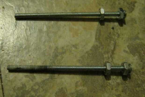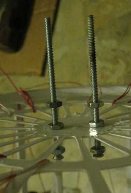 Cada par de cables necesita un post para adjuntar a. En esta foto, 3 pulgadas que tornillos 6-32 se utilizan para hacer entradas. Los agujeros de poste se deben hacer para que ellos pueden emparedado el transformador de 75-300 ohmios entre ellos. Los agujeros se forman calentando uno de los tornillos de modo que puede meter un agujero de tamaño adecuado en la parte inferior de la cubeta. Cuatro pernos deben utilizarse por tornillo para sujetar el plástico. Por tornillo, dos sujetar el tornillo en su lugar. Los otros dos son para la conexión de los cables.