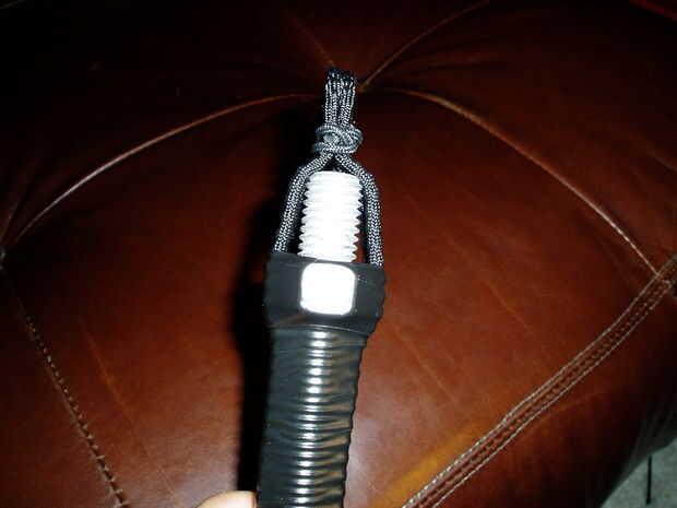 * esta sección aquí: deseo hubiera reforzado la tuerca con ya sea eléctrica o cinta gorila... después te Envuelva la tuerca con la cinta para hacer una forma esférica [recuerda: no demasiado grande, se coloca cable de choque y dos capas de paracord en la parte superior] Coloque su mano a través del lazo y ponga su mano alrededor de la tuerca... sentirlo para la zona de confort , pero no usar demasiado maldita ahorrar habitación para las tres capas...