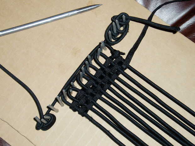 2.2 - i en la parte superior-derecha... usé un nudo constrictor para asegurar el paracord para el cable de descarga pero es mejor solo usar una aguja y un hilo de rosca y coloque el paracord bajo la cuerda de choque, luego sobre y aguja e hilo esa sección a la cuerda de choque... cortó el paracord exceso... luego sobre y bajo la manera entera a través de la armadura...