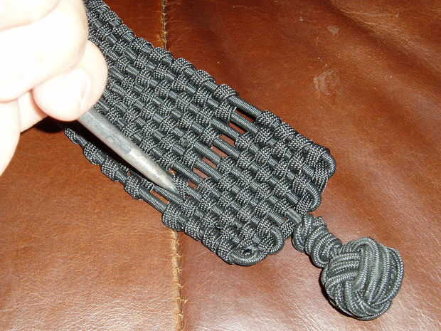 2.6 - marlinespike solía limpiar el tejido... no coloque el cable de choque alrededor del cuello, en su lugar se utiliza una aguja y del hilo de rosca... comienzo desde la parte superior, hacer un lazo alrededor del cuello, aguja de lugar a través de hacer un nudo y repite el proceso un millón de veces hasta llegar al marcador pulgadas desde el puño del mono...