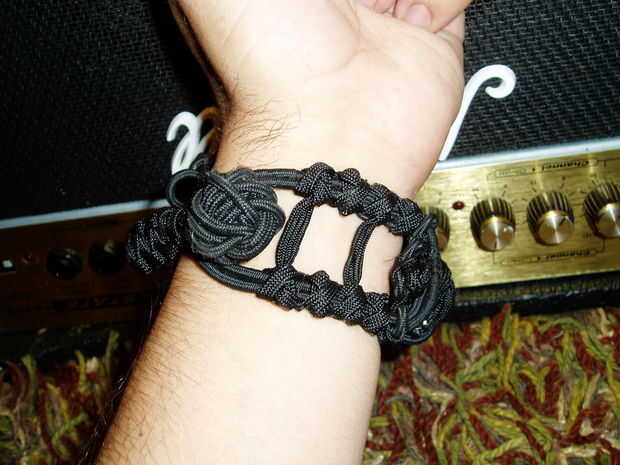 vi la pulsera del paracord por Stormdrane un par de meses atrás y tuvo que hacer algunos; una noche, mientras insomniacking, inspirado y tuve una epifanía: ¿por qué no hacer un brazalete de paracord, usando un puño de mono y un lazo como un cierre, e