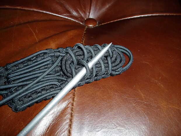 7.5 - en primer lugar, asegúrese de que probar la pulsera y si cabe a la derecha, utilice el marlinespike para apretar los lazos libremente como se muestra; pero no, repito, no apretar los lazos demasiado apretados, lo suficiente como para mantener el cracker y caen en su lugar... recuerda: el lazo debe ser aproximadamente de 2,5 a 3 pulgadas...