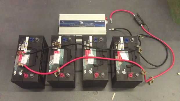 La configuración es realmente muy simple. Agarré un juego de cables de arranque, corte piezas del aislamiento y había conectada a las baterías y el inversor de corriente. He utilizado cables de arranque porque puede manejar el amperaje alto y son realmente baratos.