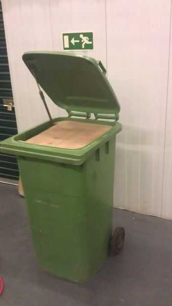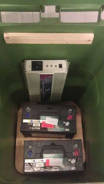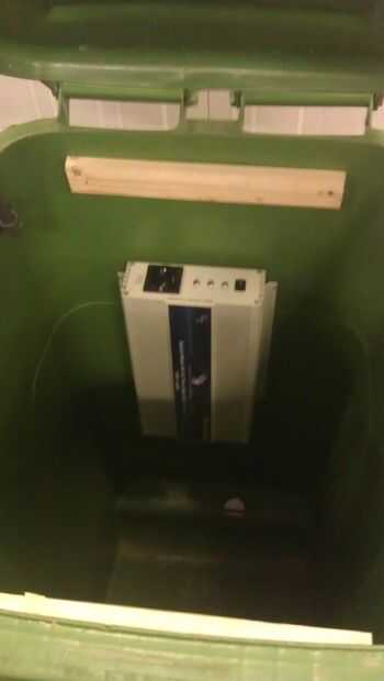 Hice algunas pequeñas mesetas para las baterías y el proyector para estar de pie y conectado a un cilindro de gas para mantener el bote de basura de cierre.
