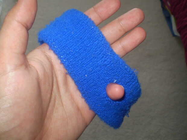 En cuanto a cortar los agujeros en la venda, no hacer cualquier cráteres, jeje. Sólo desea una rendija para que las yemas queden firmes y en no caen.