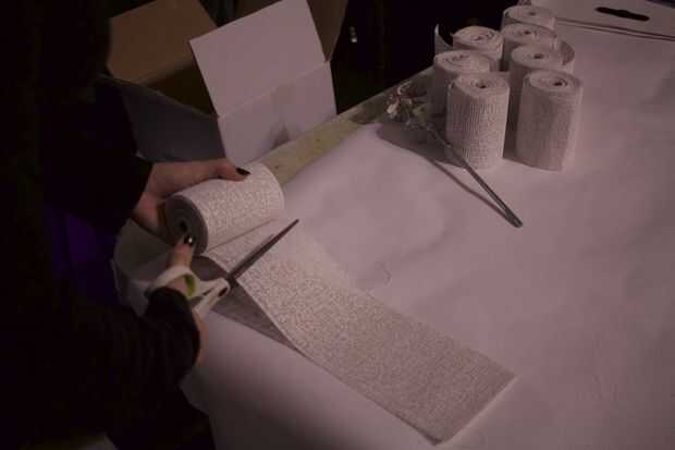 Gasa de escayola normalmente viene en rollos, cortadas tuyo antes de comenzar en secciones de 8-12 pulgadas. Proyecto de arte más y menos momia. Tiras más cortas hará más fácil de manejar y mucho más fácil de corregir errores.