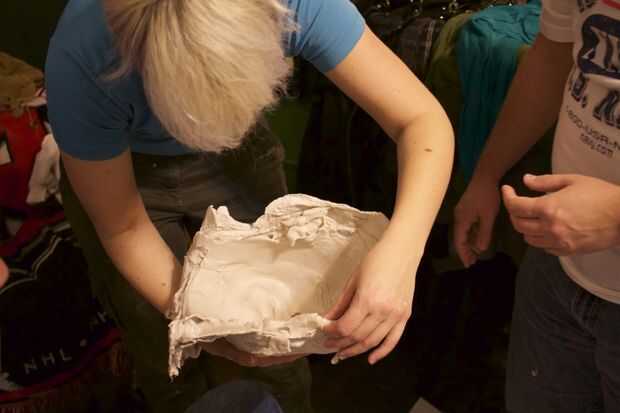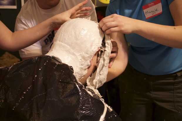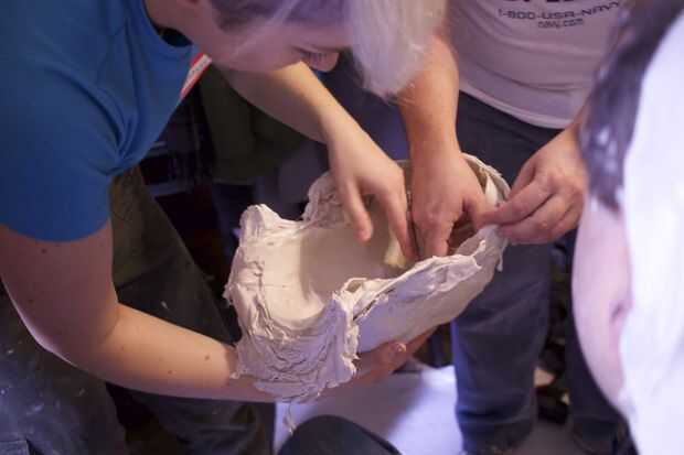 Para quitar el molde delantero, usar algo fino y flexible para trabajar debajo del borde de la línea de rotura. Tire de ella hacia adelante desde la parte superior y deje que se caiga hacia delante y hacia abajo con alguien para cogerlo. Puedes hacer retoques en este punto, pero debe ver muy bien. También, recuerde dejar el respirar de la modelo.