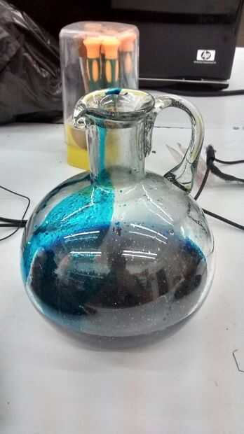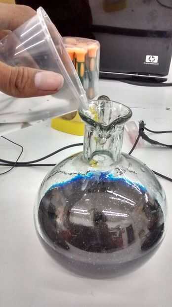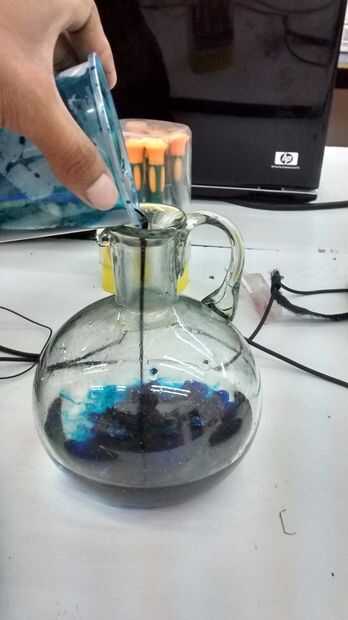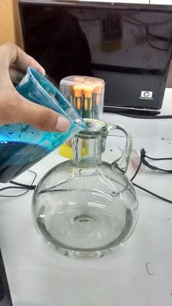 Insertar la solución (la pintura azulada) en la botella poco a poco.