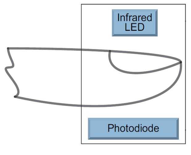Este proyecto describe un sistema de medición de ritmo cardíaco basado en microcontrolador que utiliza sensores ópticos para medir la alteración en el volumen de sangre en la yema del dedo con cada latido del corazón. La unidad del sensor consiste en un infrarrojo-diodo emisor de luz-(IR LED) y un fotodiodo, colocados lado a lado como se muestra a continuación. El diodo IR transmite una luz infrarroja en la punta de los dedos (que se coloca sobre la unidad del sensor), y el fotodiodo detecta la porción de la luz que es reflejada. La intensidad de luz reflejada depende del volumen de sangre dentro de la yema del dedo. Por lo tanto, cada latido del corazón altera ligeramente la cantidad de luz infrarroja que puede ser detectada por el fotodiodo. Con un acondicionamiento de señal apropiado, este pequeño cambio en la amplitud de la luz reflejada se puede convertir en un pulso. Los pulsos pueden ser contados más tarde por el microcontrolador para determinar la frecuencia cardíaca.
