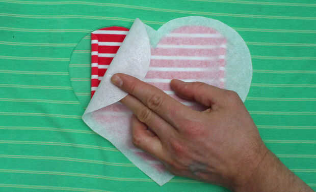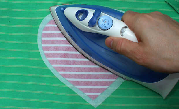 2. Posición del estabilizador de tela en forma de corazón con la parte pegajosa hacia abajo en la camisa y el calor desliza la plancha (fabricantes leer instrucciones)