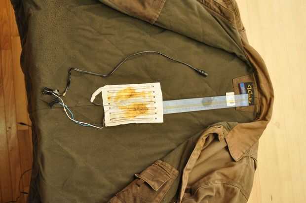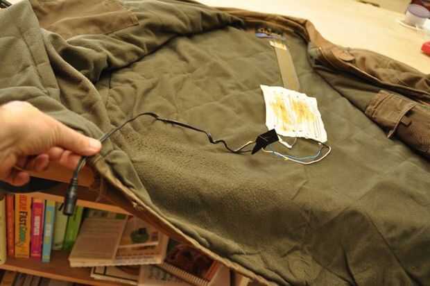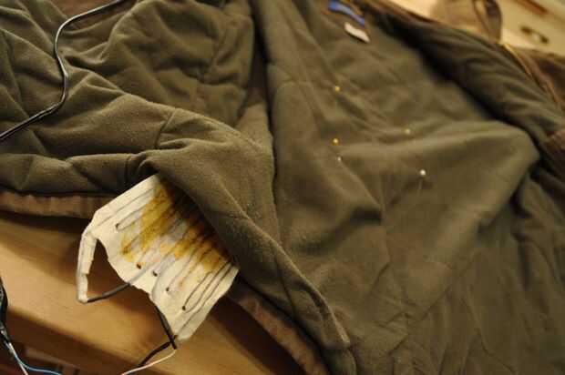 A continuación, abre la capa y trazado donde quería el elemento de calefacción para ir. También miré para ver donde quiero el cable de alimentación para salir de la capa. Me decidí por el dobladillo de la parte inferior derecha, ya sería un buen lugar para que cuando yo estoy conduciendo un coche - cerca de la toma de corriente de coche de cinturón de seguridad y 12V. (Si desea sobre todo la capa caliente para trabajar con una batería pequeña de 12V, usted podría hacer el cable de salida en un bolsillo, donde almacenas la batería.)