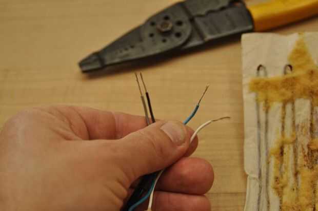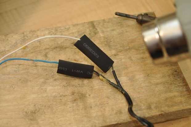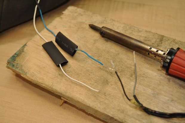 Yo había despojado los extremos de los cuatro cables, resbaló en un pequeño tubo del encogimiento y soldar los dos pares de cables entre sí. Deslice el tubo del encogimiento sobre la conexión desnuda y calentarlo a encogerse en su lugar. Cinta aislante funcionan bien también.