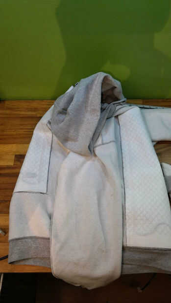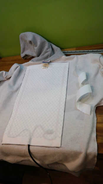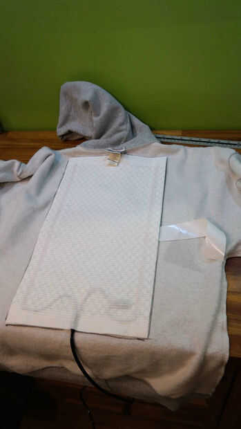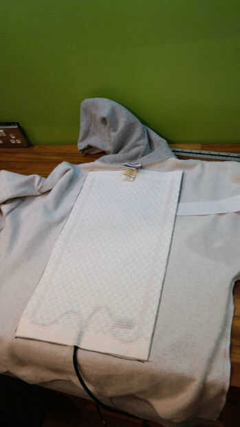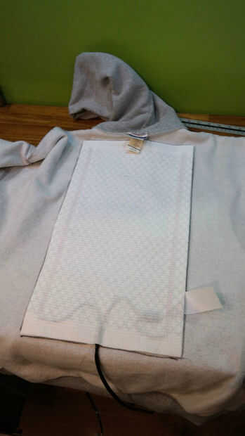 Con la sudadera con capucha interior hacia fuera, coloque una almohadilla donde quiere, suba la esquina y empezar a pele apagado el forro adhesivo. Mientras sostiene la almohadilla en su lugar, extraer el forro por debajo de la almohadilla y presione hacia abajo sobre la tela.