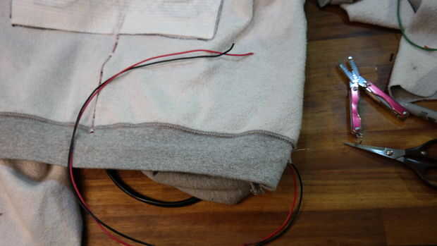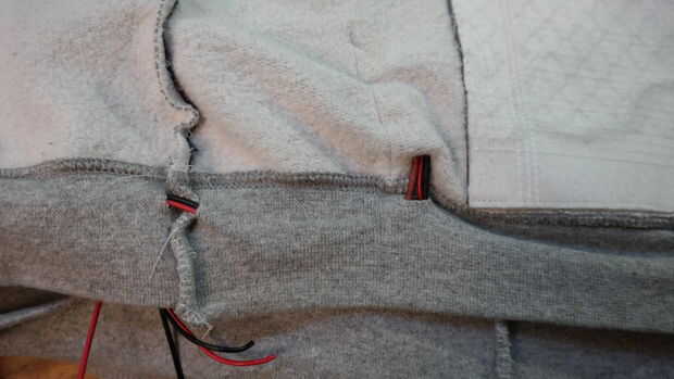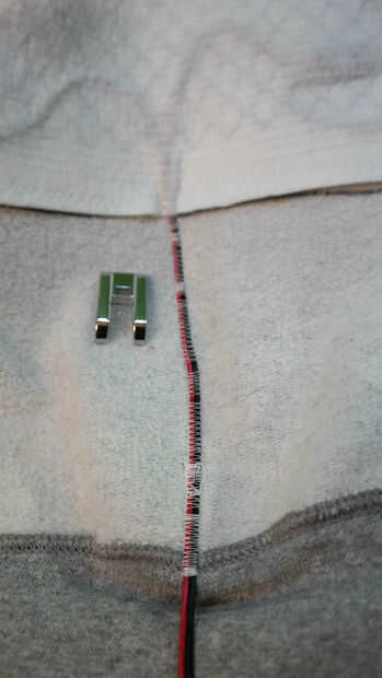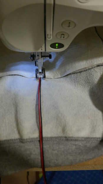 Para obtener los cables de las pastillas en el bolsillo asomó en la pretina elástica de la sudadera con capucha. Usar algo puntiagudos como un lápiz afilado para crear un agujero en la tela del knit sin cortar los hilos de rosca, entonces puede alimentar los cables. Usé un pie cordones en mi máquina presionado los hilos con un ancho de puntada.