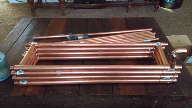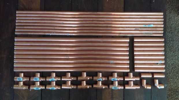 Una vez que han reunido su colección de tuberías y accesorios es el momento de conseguir corte! Con un cortador de tubos (o herramienta similar) corte el tubo a las longitudes que se enumeran a continuación. Usted puede hacer el enfriador más corto mientras que usa la misma cantidad de tubo de cobre, sin embargo usted lo necesita más tee accesorios (y tubo de silicona), y usted querrá asegurarse de que la longitud de la tubería interior es uniformemente divisible por 10' maximizar el uso del cobre. Por ejemplo, podría acortar el tubo de 1/2" a 24" en lugar de 30" y tiene 10 secciones en lugar de 8. Esto requerirá entonces otro tes 2 y usted tendrá que ajustar el tubo de 3/4" para que coincida con el nuevo tamaño. Voy a enumerar las medidas con que fui.