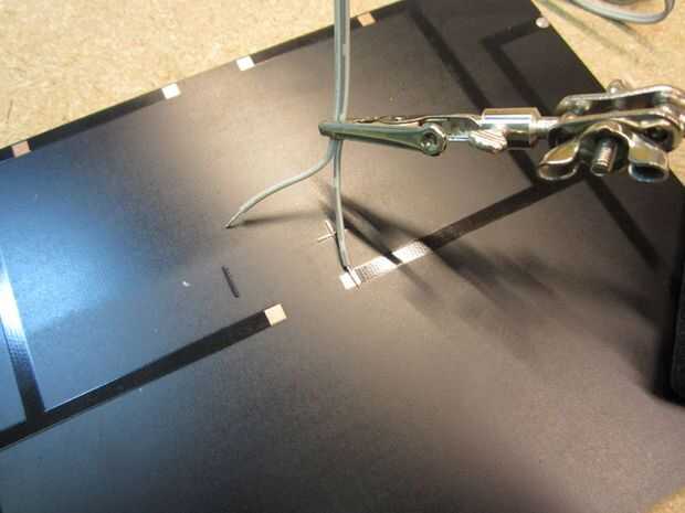 Segundo, prueba el cable hacia fuera. Para estar seguro. Enchufe al conector de barril en el tablero de litio. Ahora presione los cables a los terminales positivo y negativo en la célula solar (cuando está apuntando hacia arriba y en parte de la luz). Si se ilumina el tablero de regulador de carga de litio, los cables están bien. Si no, pruebe a invertirles. (En la posibilidad de los cables y el conector de barril son extrañas o al revés).