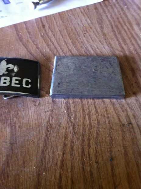 Se dijo, vagaron por el mercadillo local para encontrar una hebilla de la correa usada y topé con el Quebec una, Foto de arriba. Mi plan inicial era utilizar la hebilla como base, cortar y soldar en una placa de acero o similar tamaño y grabar todos los detalles en. Este plan rápidamente murió, sin embargo, dado que yo estaba mal equipado para precisión detalles de placa de acero. También es demasiado fina confiablemente soldar nada a la hebilla del cinturón. Como cualquier proyecto pasa por una serie de versiones antes de convergen en el criterio de éxito, pensé que me gustaría añadir en las imágenes de este enfoque como una herramienta de aprendizaje.