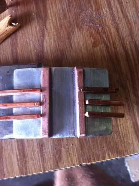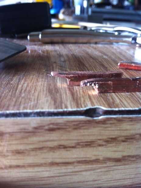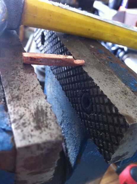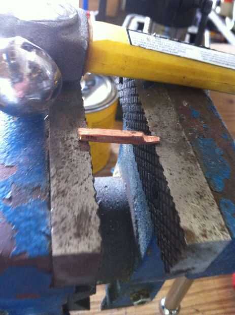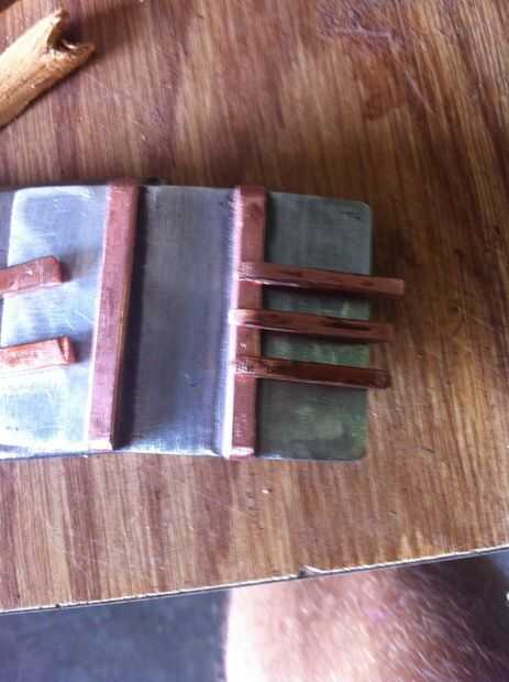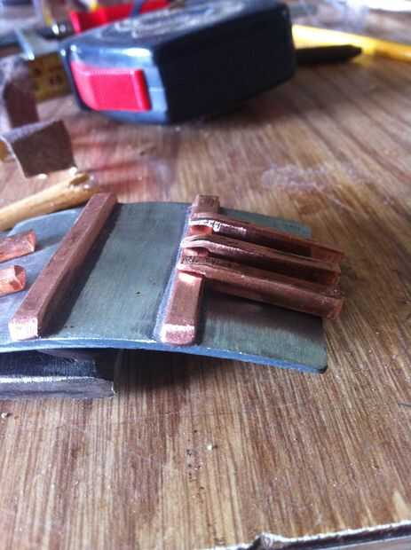 Cada una de las piezas más largas, tierra abajo la alza hacia extremos redondearlos y lijar luego para caber. Para obtener piezas más pequeñas se superponen a los más, solía el borde de mi muela amoladora cortar el cobre y deja sobre un milímetro de proyección. Para seguir la curvatura de la hebilla y la proyección hacia abajo para caber firmemente contra la pieza más larga de la curva, utiliza el vicio otra vez, inclinada hacia abajo la pieza de cobre sobre los extremos abiertos y derivándolo hacia el centro de la curva lo. Ver las fotos para tener una idea de cómo hacerlo. Asegúrese de tomar su tiempo con los detalles de estas piezas hará toda la diferencia.