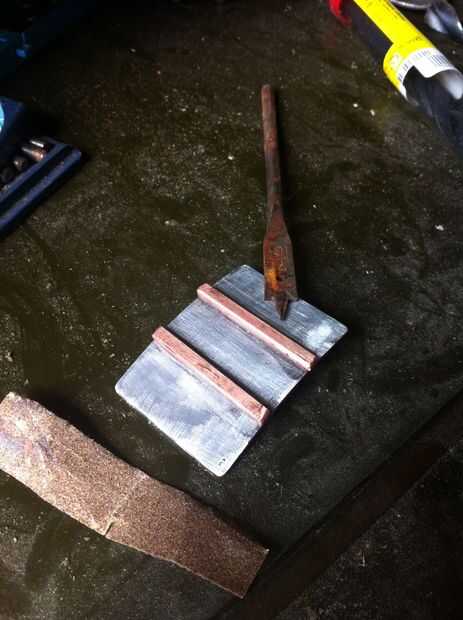 Mezcle su metálico epoxi y luego ponen en sus obras iniciales. Empecé con las piezas paralelas más largas para asegurar una base sólida para luego epoxy los más pequeños en. Una vez configurado, uso un filo para raspar lejos del extra de epoxy. Para esto usé la punta de una broca, funcionando a lo largo de los bordes. Esto ayuda a limpiar la mirada significativamente!