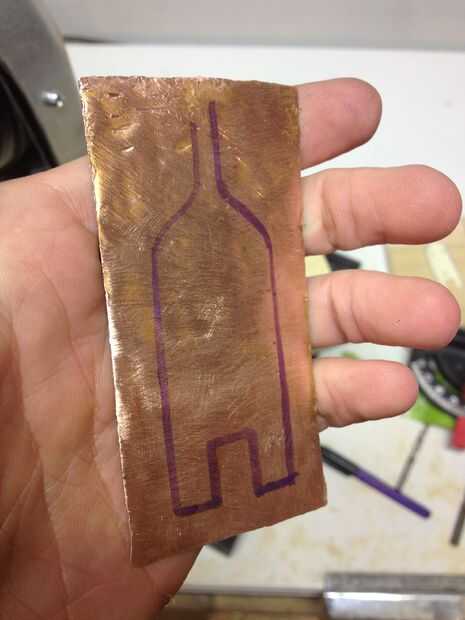 Corte mi plantilla de papel y la sostuvo sobre la placa de cobre. Marque alrededor de él. Para pequeño trabajo complicado, podría usar algún adhesivo en aerosol y coloque la plantilla en la placa y solo corte a través de la plantilla.