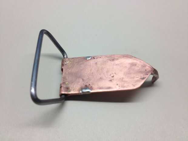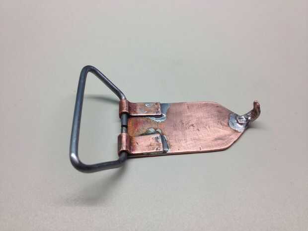 Una vez que el anillo se había modificado, I volver a colocar la hebilla y había doblado las correas todo el camino sobre el anillo. El cobre tiende a "doblar" en lugar de "arco" alrededor del anillo, por lo que sujeta la hebilla en la mordaza, atrapando el anillo. Guardé un poco de espacio entre el anillo y la parte superior de las mordazas y apretó hacia abajo. Algunos golpes con un martillo ayuda a doblar la correa alrededor del anillo, hacer una bisagra del tipo. Cuando se suelte la hebilla, las correas serán probablemente primavera volver un poco y no estar tocando la hebilla. Lo arreglaremos un poco.