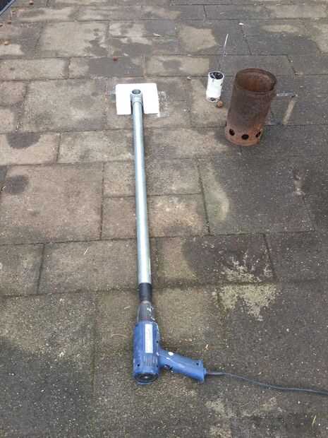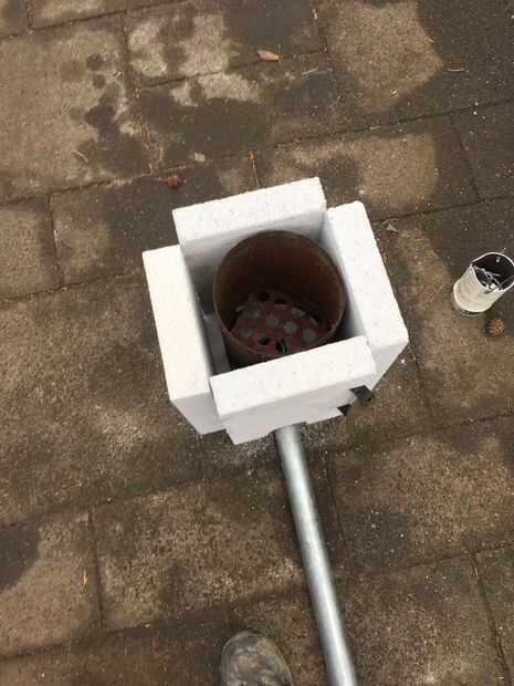 Un tubo conectado a un ventilador fue colocado debajo de una chimenea de carbón.