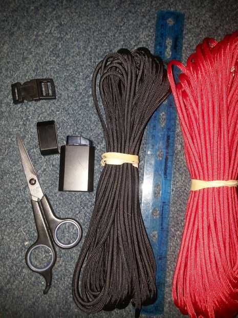Para esta pulsera se necesita 550 paracord, una hebilla de plástico (1/2" o 5/8"), dispositivo de medición, dispositivo de corte y un encendedor.