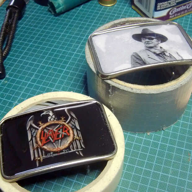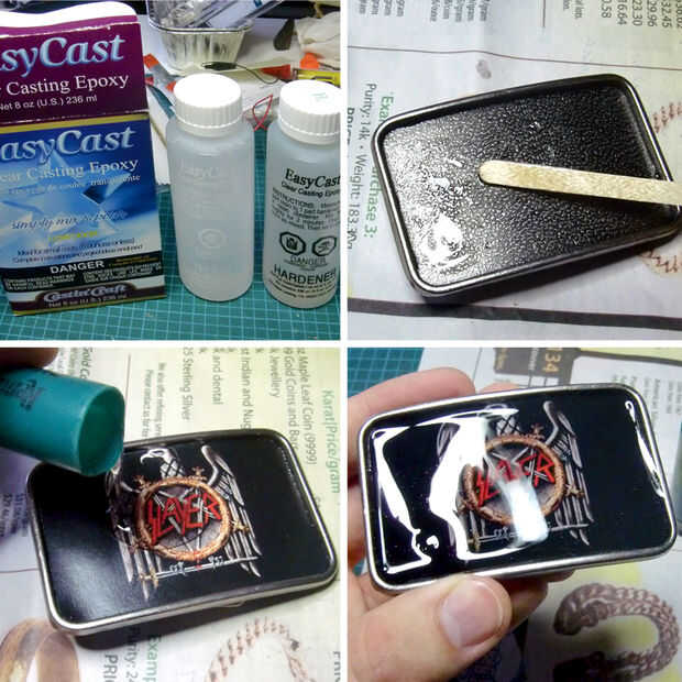 Usando la varilla de mezclar una pequeña cantidad de epoxi se aplicó a la cara desnuda de la hebilla en blanco, dando la imagen de impresión de color algo que cumplir antes de incrustar con resina. Cuando imagen o adornos se han colocado en blanco hebilla suavemente verter resina mixta sobre todo hebilla insertar. Esta hebilla es ligeramente curvada, y anticipó que la resina podría reunir en los bordes y el desbordamiento, la resina fue sólo llenada sobre a mitad de camino el inserto.