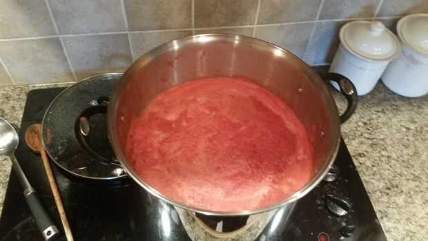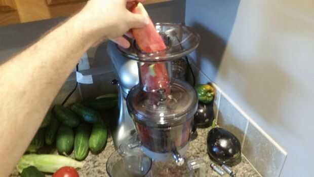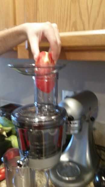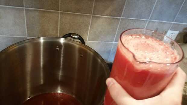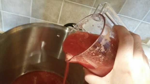 Lavar todos los tomates y sacar los tallos. Utilizamos el extractor en una cocina-ayuda al jugo nuestros tomates. No es necesario pelarlas al utilizar este extractor, sin embargo es necesario cortadas para caber en la licuadora. Jugo de los tomates y verter el jugo en una olla grande a hervir.