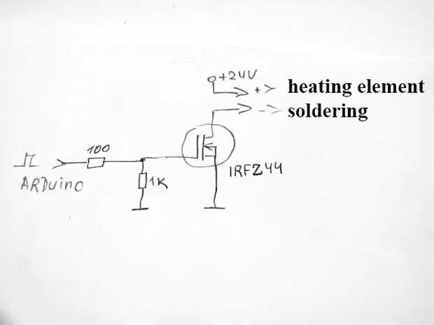 A continuación, necesitamos control (vuelta encendido y apagado) el elemento calefactor del soldador, esto ayudará a transistor de conmutación IRFZ44. Su conexión es muy simple: