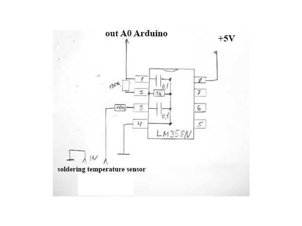 Para controlar la manija una soldador primera cosa que necesitamos para eliminar los datos del sensor de temperatura, esto nos ayudará a LM358N. Este esquema ya se está ejecutando en mí casi 2 años.