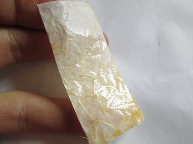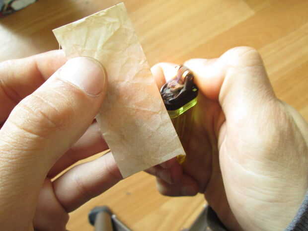 Después de quemar los bordes con un encendedor. y es más fácil cuando haces esto mientras que ha mojado todavía.