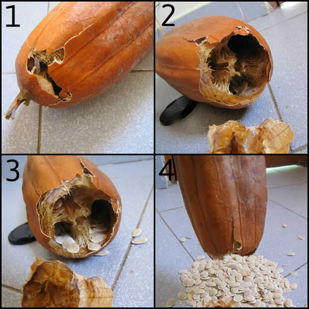 - Quitar las semillas de dentro por mover de un tirón la calabaza boca abajo. (Imagen 4). Esto debe quitar aproximadamente el 95% de las semillas en su interior.