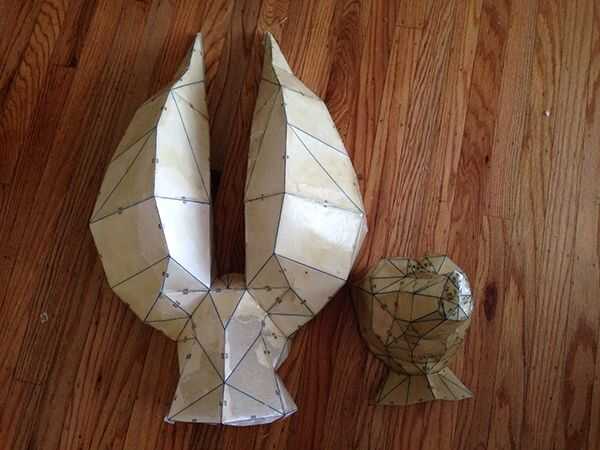 Una vez que se corta la cáscara de papel, anotar en las líneas de doblez y encolarlos. con la cartulina pesada la cáscara puede mantener su forma sin ningún refuerzo de resina. cepillo en la mezcla de material polímero compuesto. en el interior de la la concha. y la concha a la base de madera.
