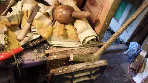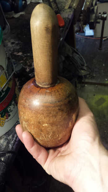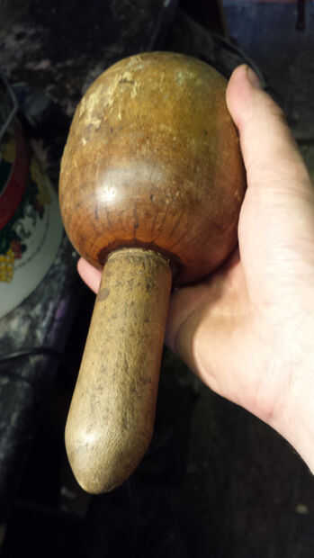El mazo que hace décadas atrás de un rodillo de madera cortadora de pasto viejo. Esto da una cabeza semiesférica de cylinderical redondeada para el mazo. Se trata de una forma muy eficiente, ya que permite el martillo a ser utilizado desde cualquier ángulo sin estrés en la muñeca que lo contrario ocurre cuando tensar la muñeca para sostener un martillo cuadrado en la alineación correcta. Esto puede ver trivial, pero si usted se-tallado a mano con golpes de mazo repetitivo durante unas horas, esta forma guarda una carga de fatiga dolor (y potencialmente a largo plazo discapacidad).