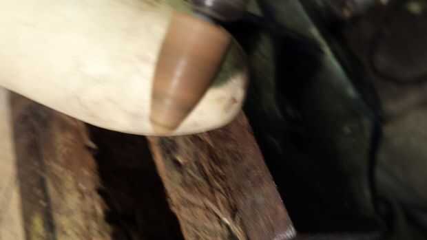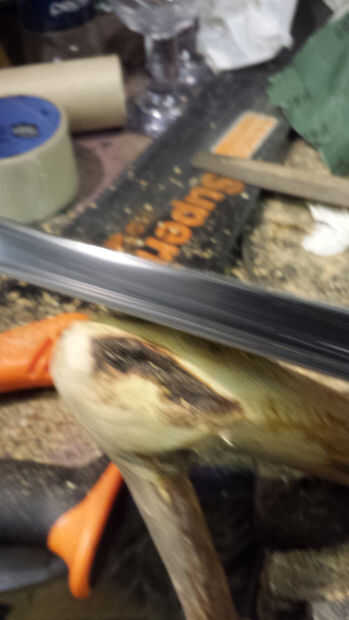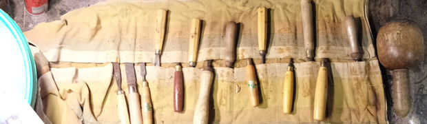 El desbaste hacia fuera fue hecha con cinceles (aquí se muestra en su roll de herramienta hecha a mano!), Surform planos y archivos de metalistería. Estas herramientas son excelentes para las curvas de la superficie externa, pero debido a su longitud no son bueno para las superficie interna cóncavas curvas sutiles.