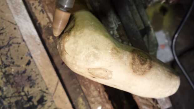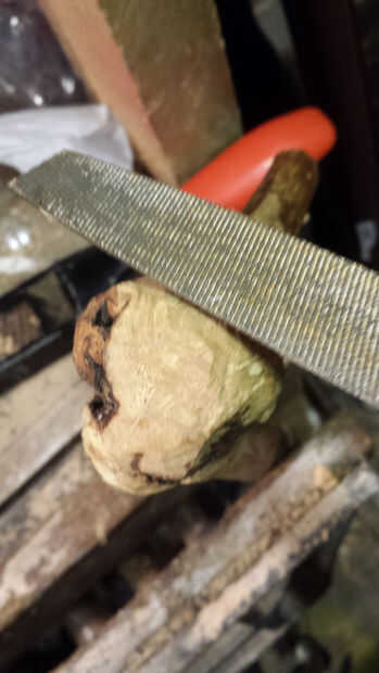Para las curvas convexas más sutiles y fino detalle, era tiempo de ir un poco moderno y salir la Dremel. Con una sucesión de bits del archivo de esmeril, la forma rugosa mano alisada y presentaron a una hermosa cabeza de curvy, ligeramente bulbosa. Holly es de grano fino y toma un buen pulimento incluso a través de la veta de la rama.