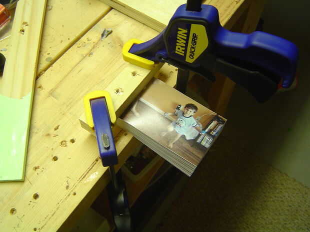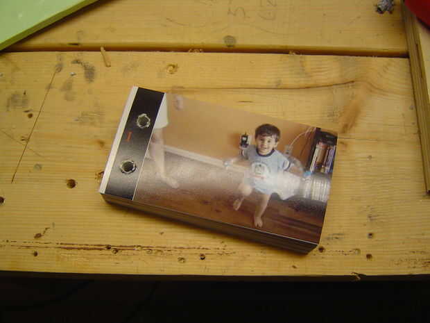 Alguien comentó que esto podría funcionar mejor sujeción en la parte superior e inferior de la pila de madera y perforando hacia abajo. Trabajó como un encanto. La madera (y Banco de trabajo en la parte inferior) mantener apretado las fotos y evitar que la broca (1/4") dañen el papel. La pila que ver aquí conserva su grosor original (aproximadamente 1") y los agujeros realmente ayudó a unir la pila un poco.