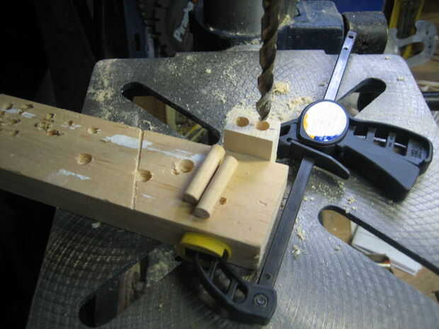 Para hacer el conector simplemente dos 1/4" agujeros en el lado de lo más grandes 1/2" espiga con una prensa del taladro, pero asegúrese de que usted no va a través de todo el camino. Luego se corta la espiga 1/8" arriba y abajo cada agujero haciendo dos piezas de 1/2" de largo con un agujero en cada uno. Luego corte una sección de 1/4" espiga de 3/4" de largo y arena ligeramente los extremos. Añadir pegamento en los orificios de los pedazos más grandes de la espiga y la espiga más pequeña en lugar en ambos orificios. Asegúrese de orientar los tacos más grandes por lo que se enfrentan a la misma dirección.